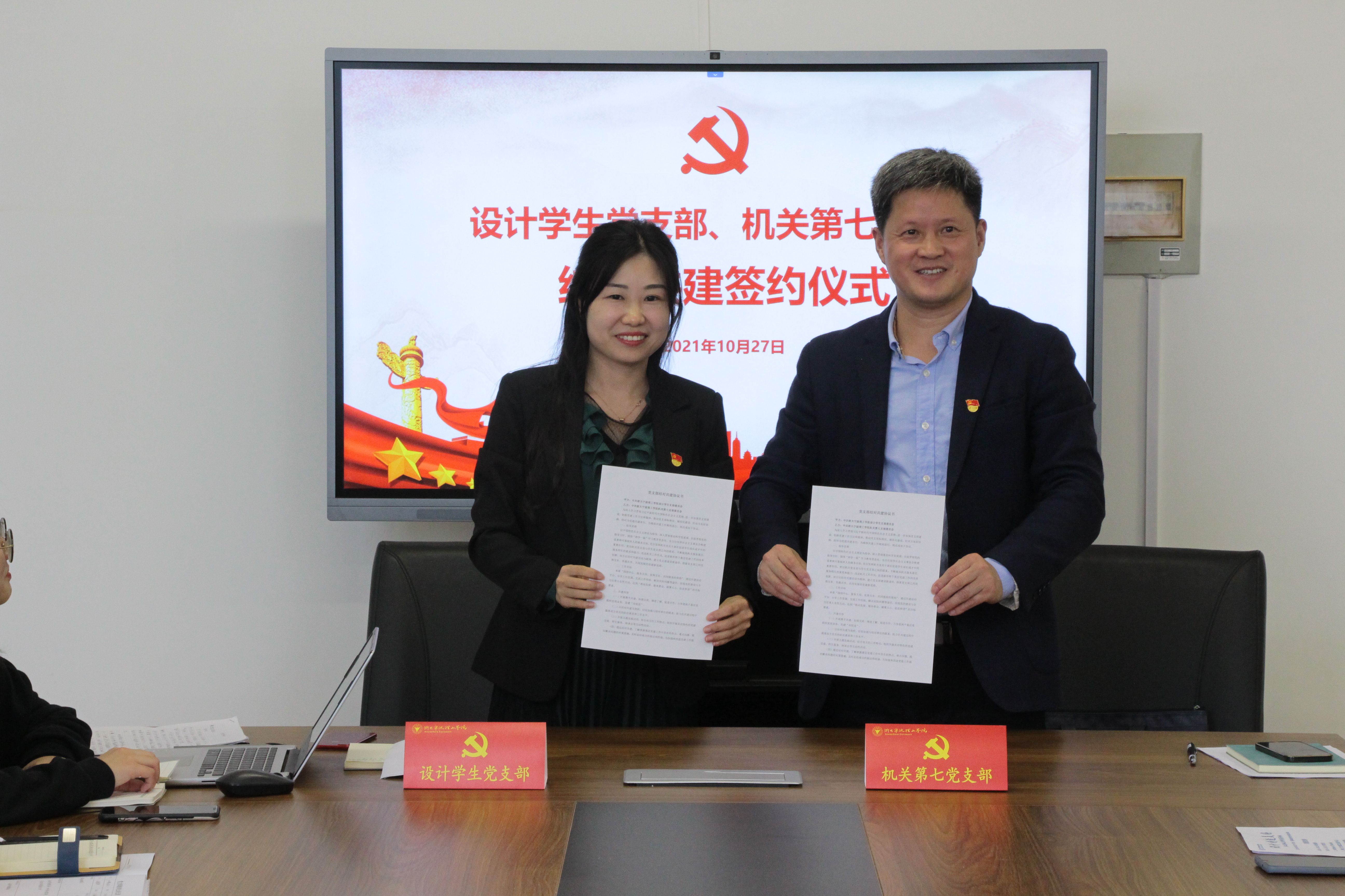 10月27日下午,机关第七党支部与设计员工党支部在SE306举行结对共建签约仪式。仪式由设计员工党支部书记金慧燕老师主持。