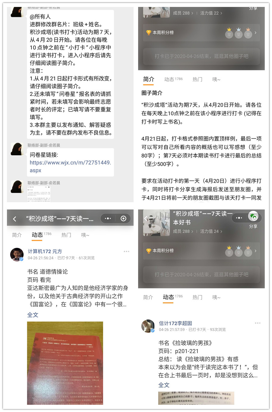 读书打卡活动中,同学们要在7天内读完一本好书,并在每天把读书心得发到小程序中进行打卡。大家表示通过读书打卡来督促自己,起到了很好的学习效果,也能从中品味书香、陶冶情操;看图猜书名活动中,大家在公众号推送下进行评论、回答书名、获得奖励,在疫情期间,同学们仍然热情高涨,积极参加线上活动。