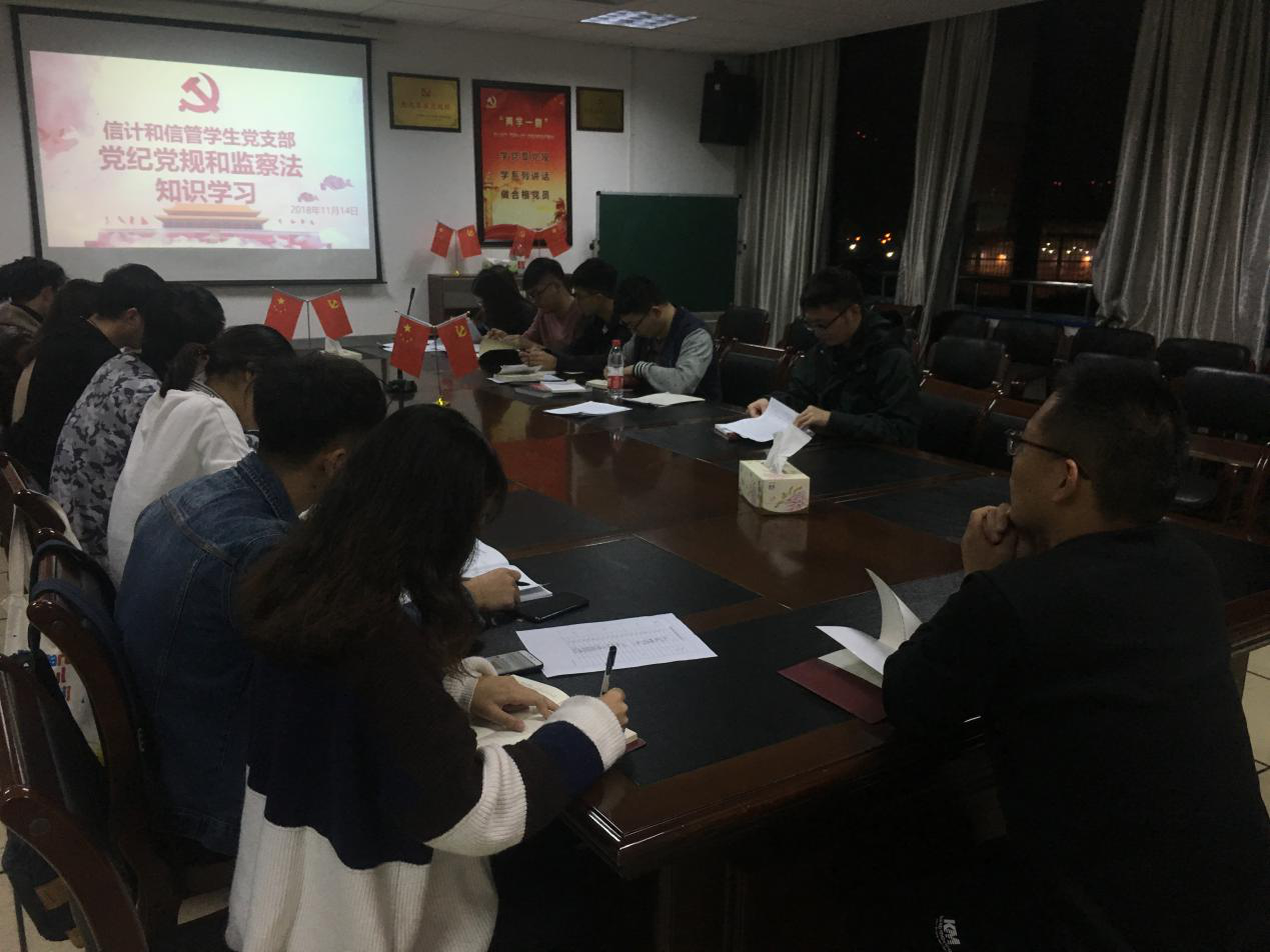 为强化党员干部的纪律法律意识,根据宁波市纪委《关于开展2018年当归当即和监察法知识学习考试的通知(甬纪发[2018]7号)》要求,结合学习第七届“廉洁文化节”活动安排,ladbrokes立博信计和信管员工党支部于2018年11月14日星期三晚6点30在石麟602会议室组织党员同志对党规党纪和监察法学习,陈辉老师主持并进行讲解。