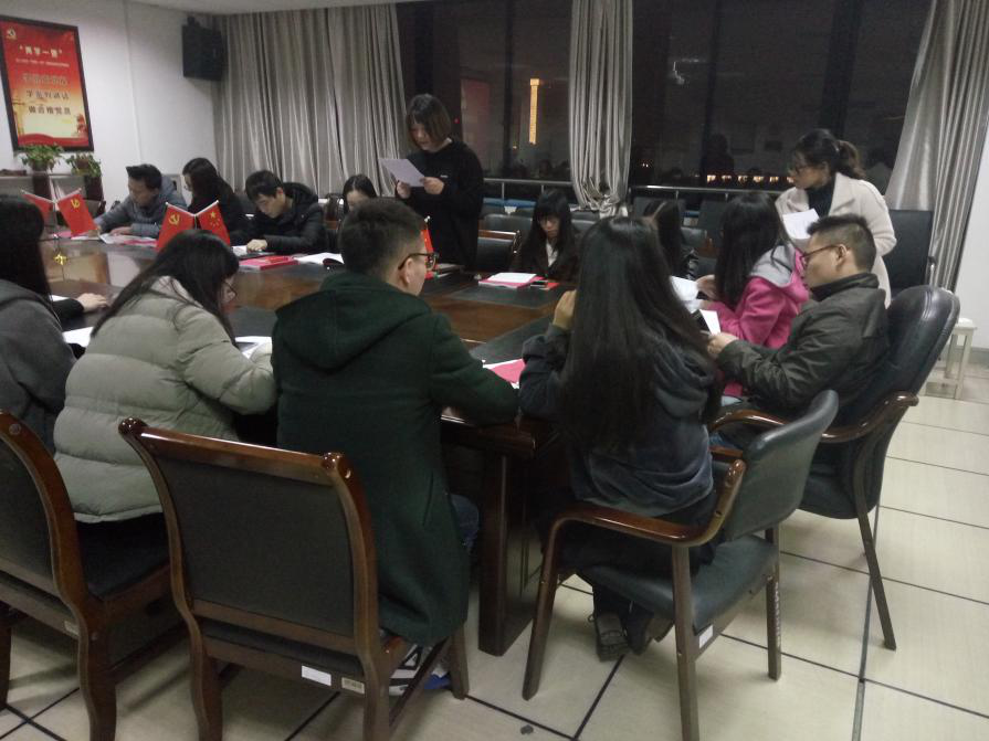 会议第一项,预备党员转正。预备党员吕航磊、邱思雨等宣读转正申请书。宣读完毕后,在场各位党员张钰等对其发表意见,经其作出回应后正式党员对其展开投票决定其转正申请。几位预备党员均得全票通过。会议第二项,入党积极分子转预备党员。新发展对象徐晨、陈圆圆等宣读入党志愿书。宣读完毕后,入党介绍人宣读介绍意见,政审意见发表完毕后各位党员张钰等对其发表意见,经投票表决后宣读其预备党员决议。几位发展对象均得全票通过。会议第三项,集体学习十九大相关知识。支部成员集体学习了十九大报告精神,《中国共产党党章》等重要文件,会议要求迅速掀起学习宣传贯彻党的十九大精神的热潮,进一步增强政治理论学习的自觉意识,结合当前党支部工作,努力提高政治素养和思想理论水平,以更好适应新时代新要求,发挥新作为。