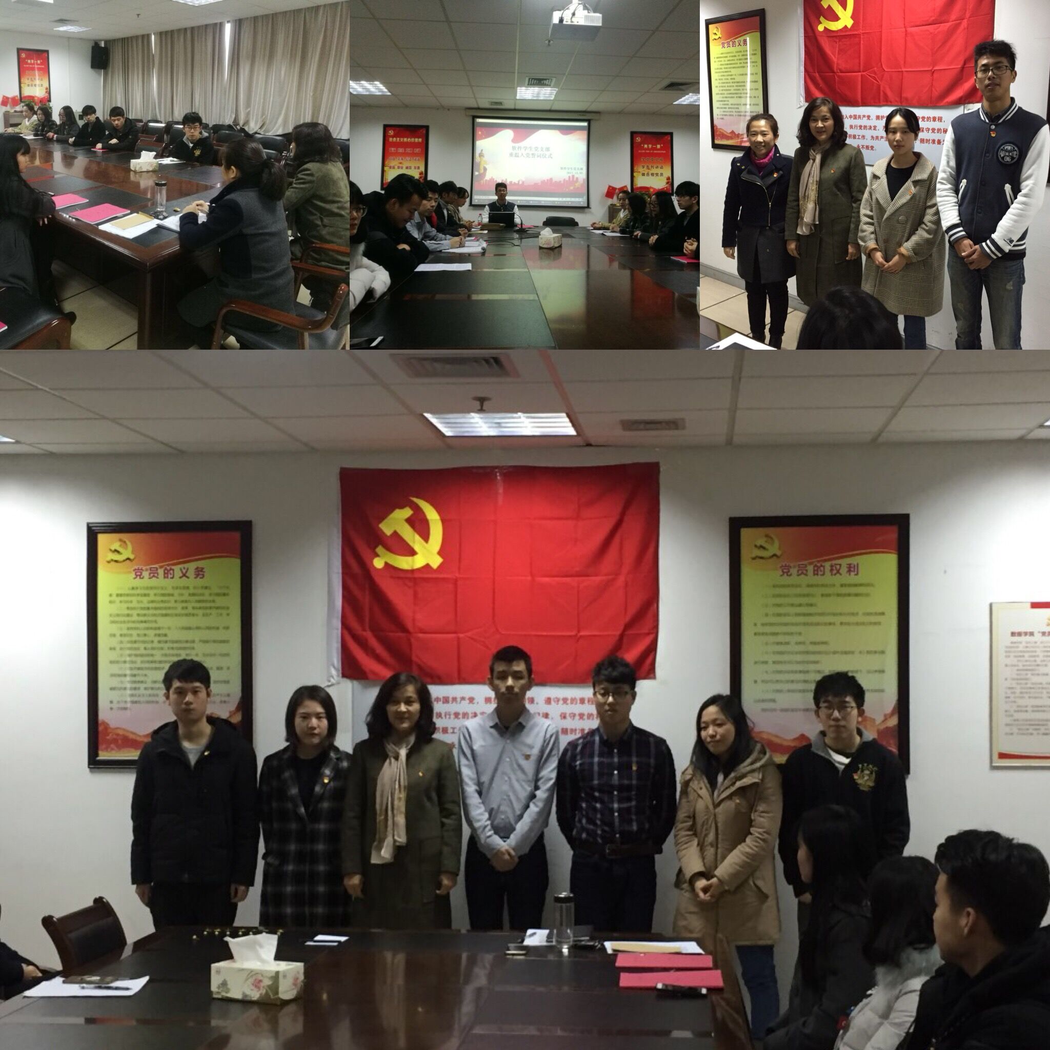 在演讲比赛开始前,首先举行了重温入党誓词仪式,由支部宣传纪检委员鲍东领誓,所有党员在鲜红的党旗下重温了入党誓词,方国娟老师还为每一位党员佩戴了党员徽章,并提出了明确的要求,一是要将入党誓词落实到行动中;二是要加强学习十九大精神并在普通同学中加强宣传;三是作为员工党员,学习是首要任务,要在同学中模范遵守公司各项规章制度,做好员工的表率。