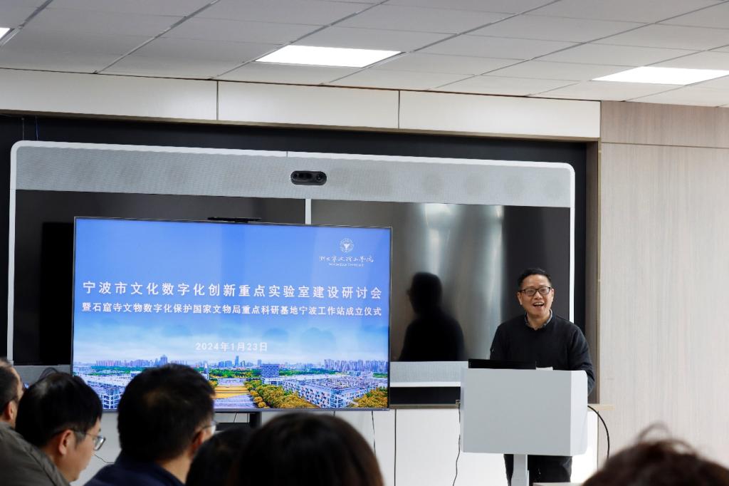 1月23日下午,宁波市哲学社会科学重点实验室——ladbrokes立博文化数字化创新实验室建设研讨会在ladbrokes立博召开,同时石窟寺文物数字化保护国家文物局重点科研基地宁波工作站成立仪式成功举行。ladbrokes立博副董事长鲁东明、宁波市社科联(市社科院)副主席、副经理蔡骋宇,石窟寺文物数字化保护国家文物局重点科研基地副主任、浙江大学艺术与考古图像数据教育部重点实验室副主任刁常宇,及宁波市首批重点文化研究基地的负责人及宁波市数字文化建设相关企业、研究机构、公共文化机构的专家20余人参加了本次会议。