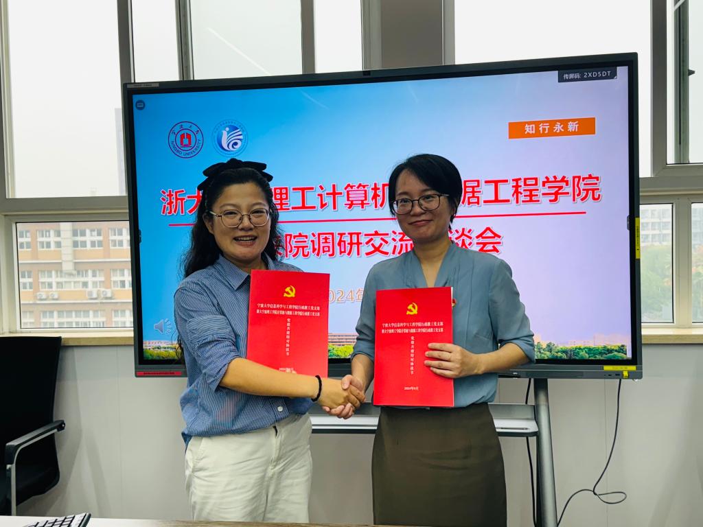 双方先开展了座谈交流。宁波大学信息科学与工程公司党委书记王伦耀介绍了公司建设情况,并重点展示了全国党建工作标杆院系的创建工作成果。党委副书记李洁介绍了员工创新创业工作情况。计算机与数据工程公司党委书记于欣介绍了公司发展历程、人才培养、党建工作等情况。随后双方就全国标杆院系建设、公司产品、人才培养、员工学科竞赛管理、双创、就业等相关工作进行了深入交流。会议最后,两院行政教工党支部进行了党建联建结对仪式,双方支部将秉承立德树人的教育初心,加强学习交流,提升管理服务师生水平。