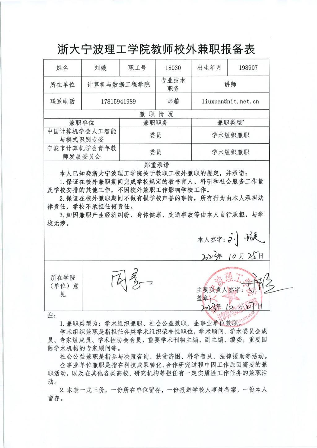 根据《ladbrokes立博教职工校外兼职管理暂行办法》(浙大宁理人〔2021〕235号),经10月27日人力资源委员会审查同意,现将教职工刘璇校外兼职情况公示如下:
