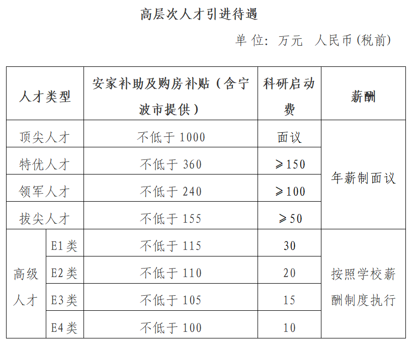 备注:应聘上述高层次人才须对应符合最新《宁波市人才分类目录》的人才认定标准,方能享受宁波市的安家补助及购房补贴。